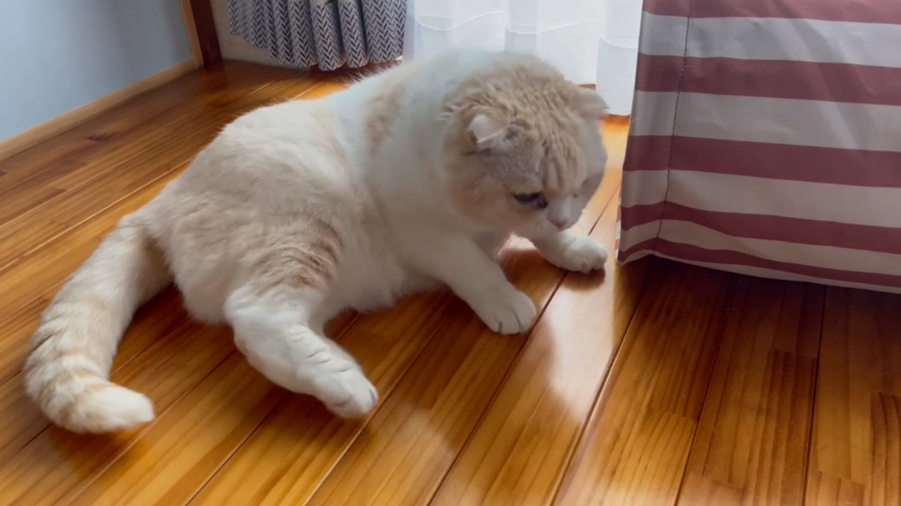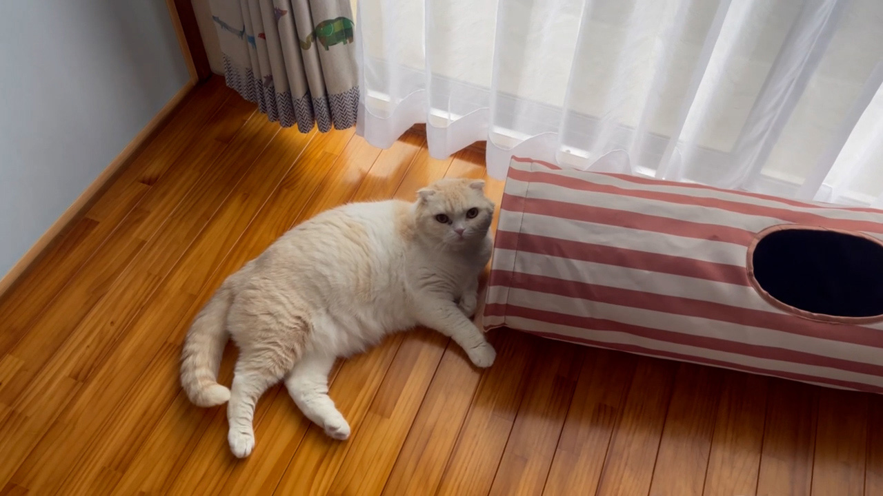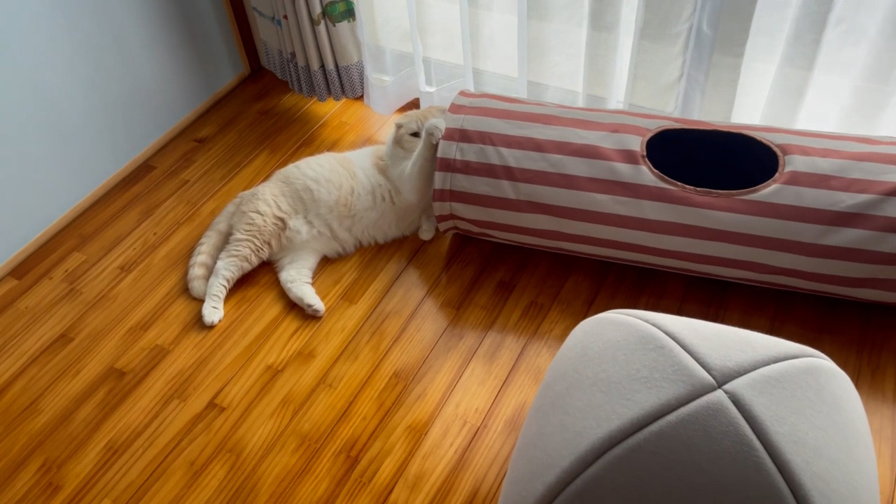 ナッツが、キャットトンネルにお手てをのせて、かっこよく横になっています。