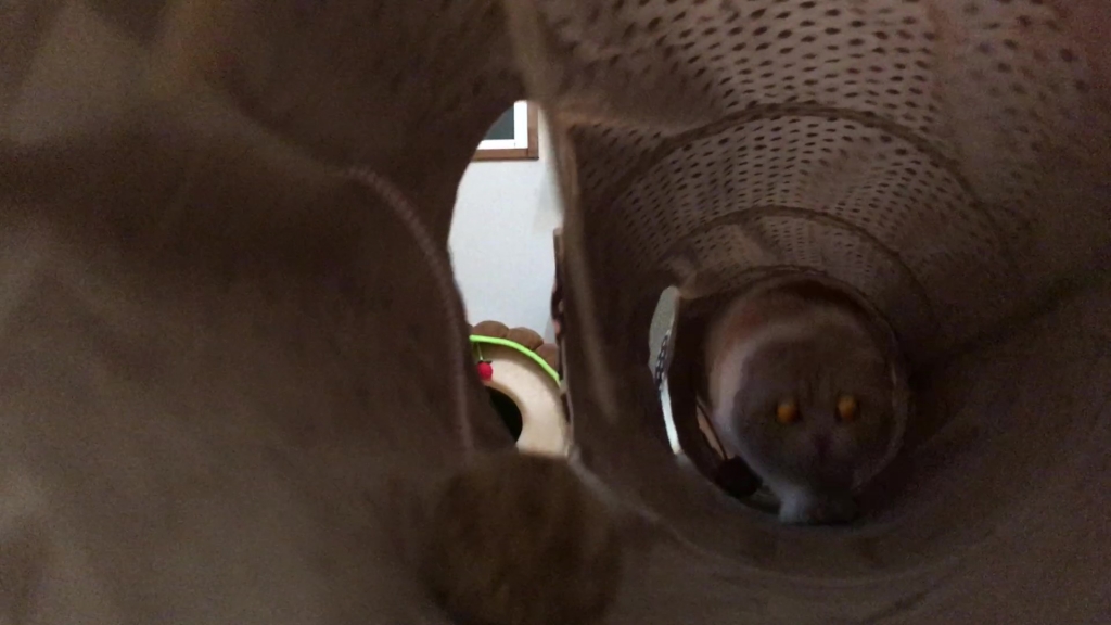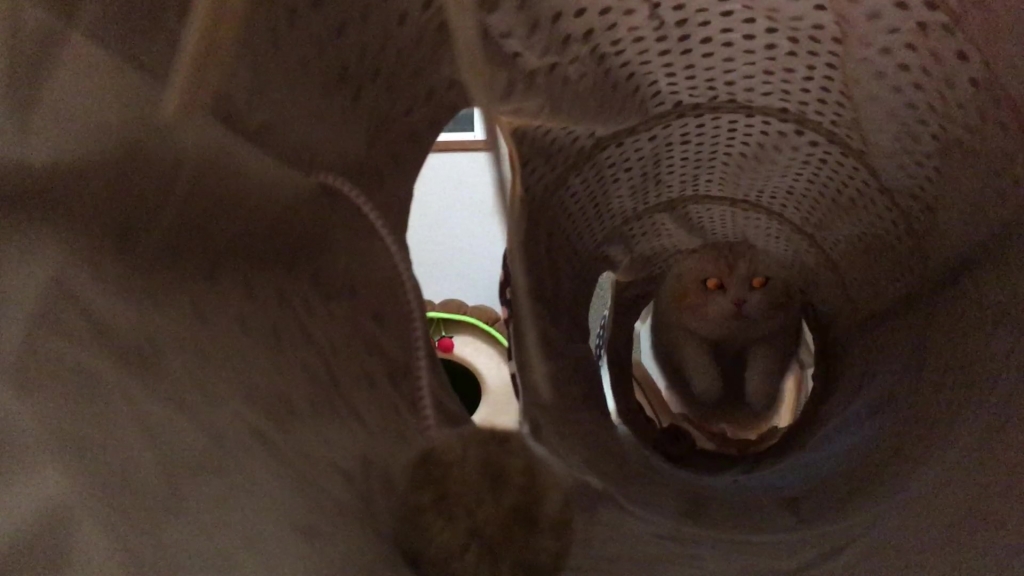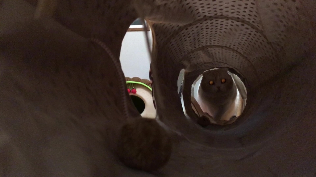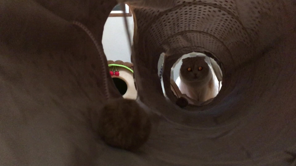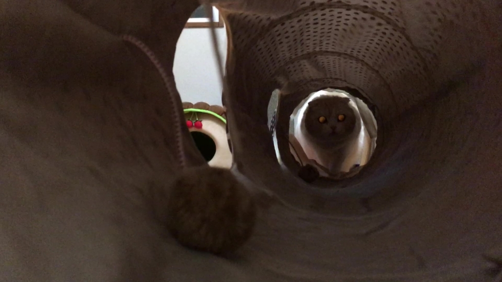 ナッツがトンネルの向こうから、こちらを見ています。