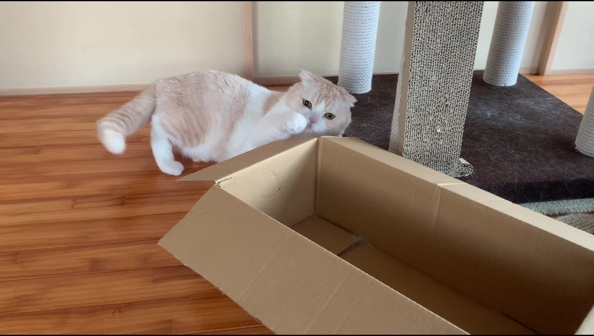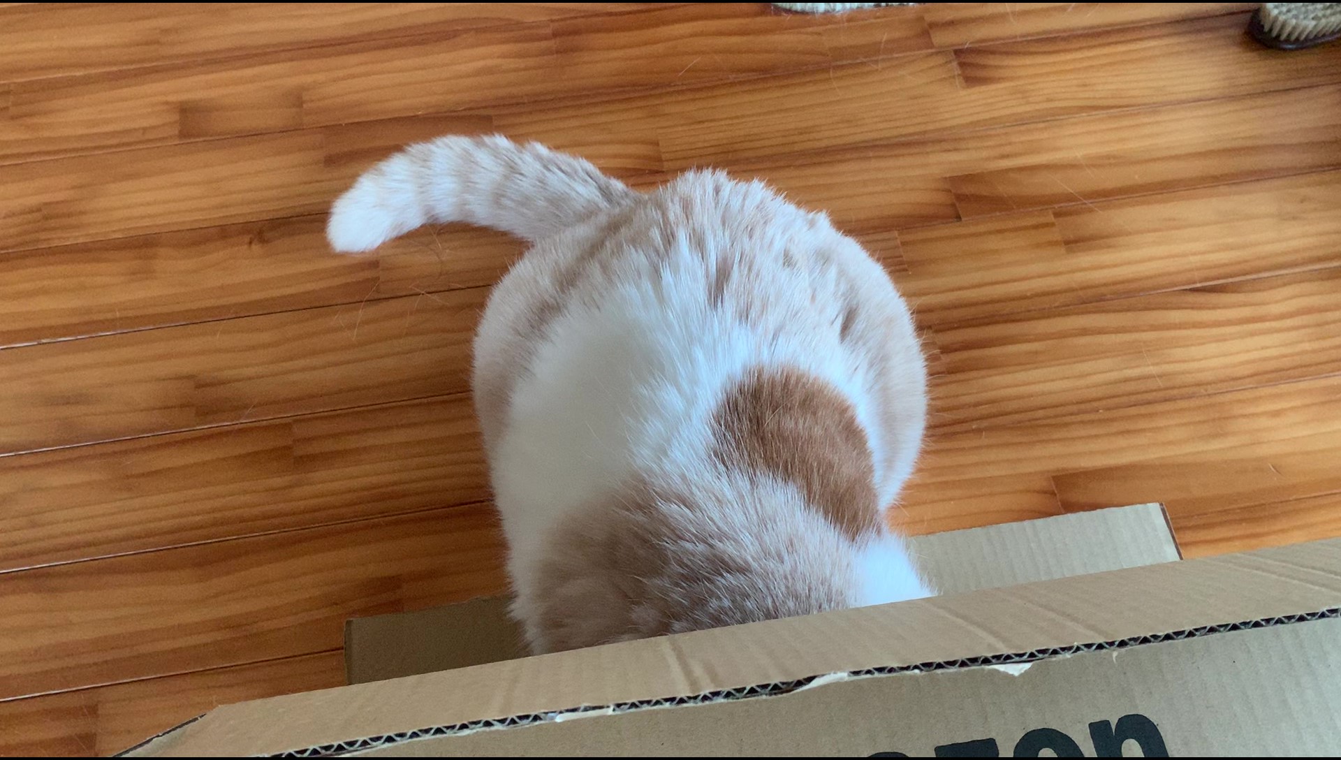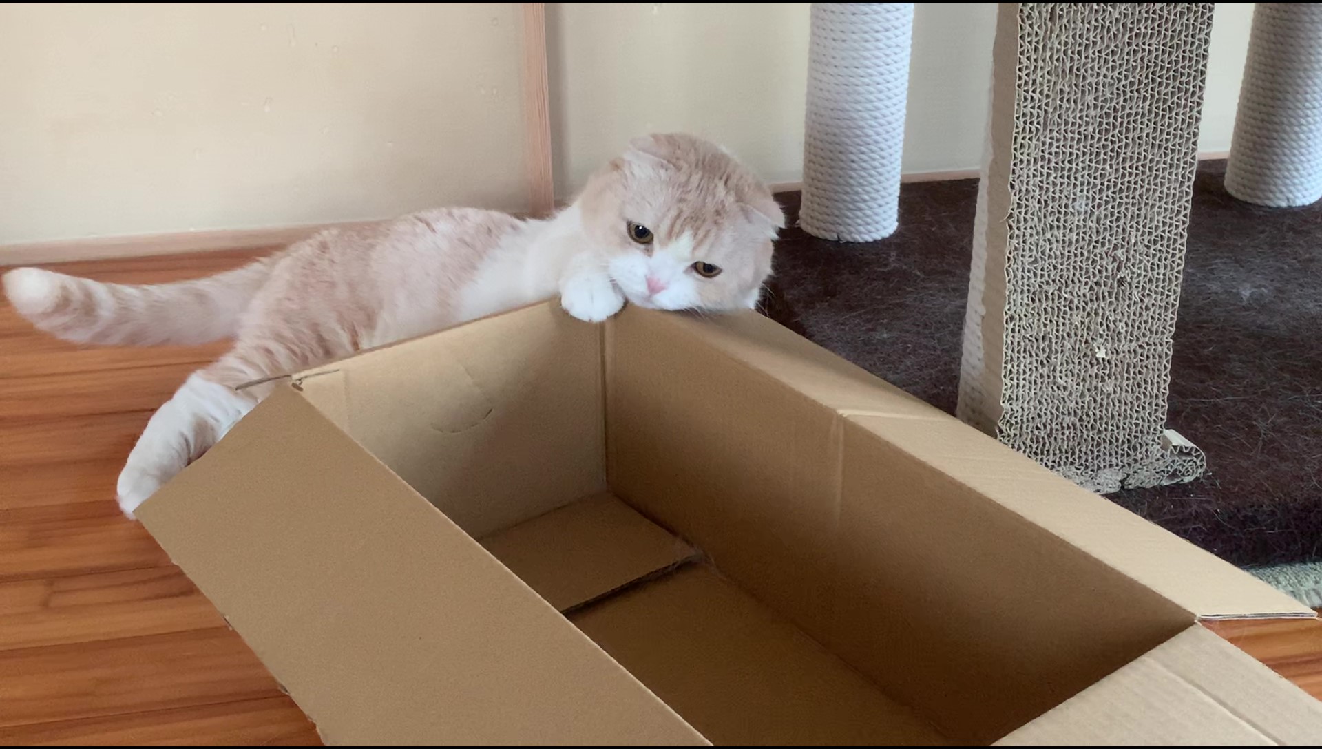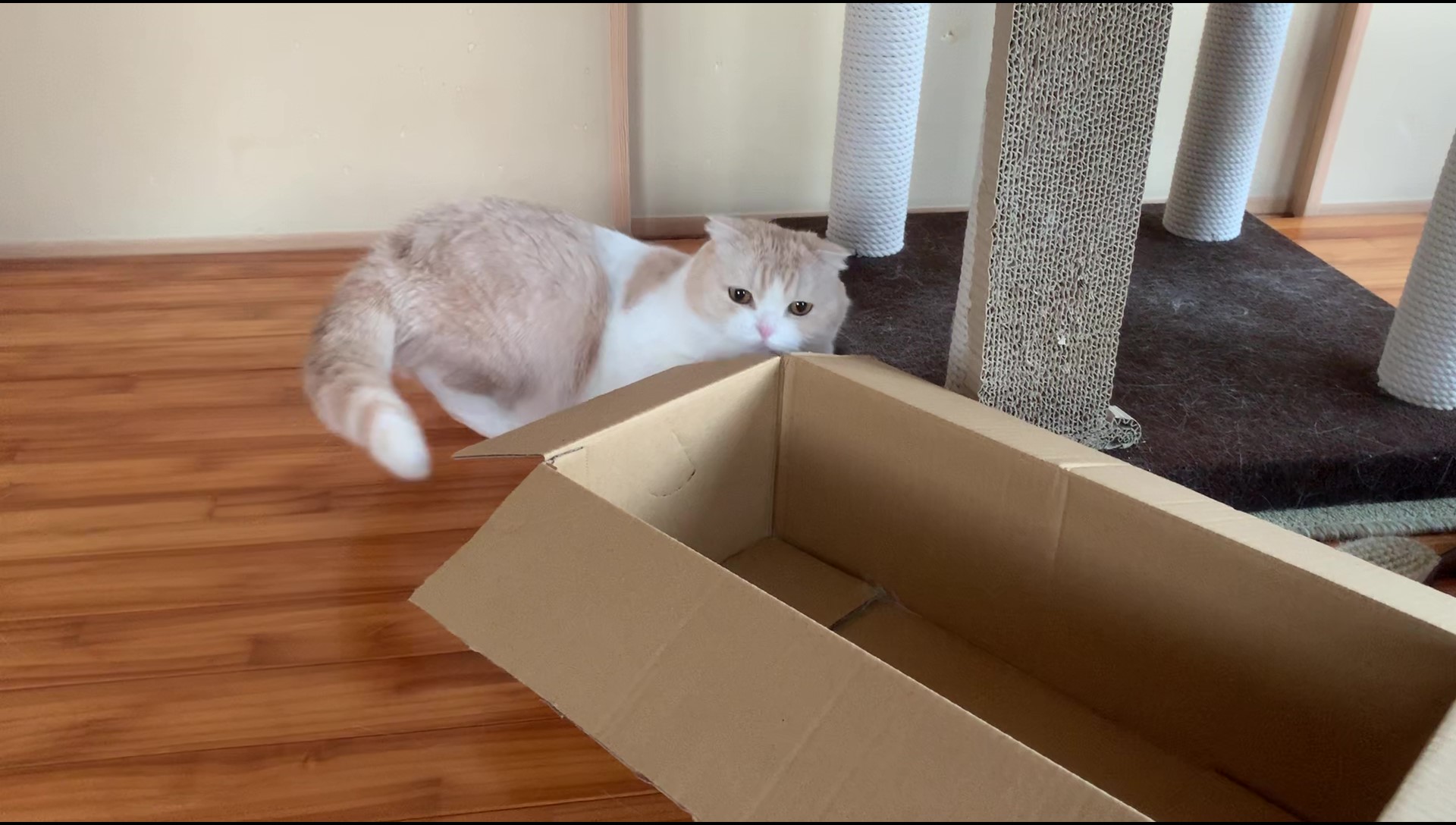 ナッツが、お気に入りのダンボール箱をみつめています。