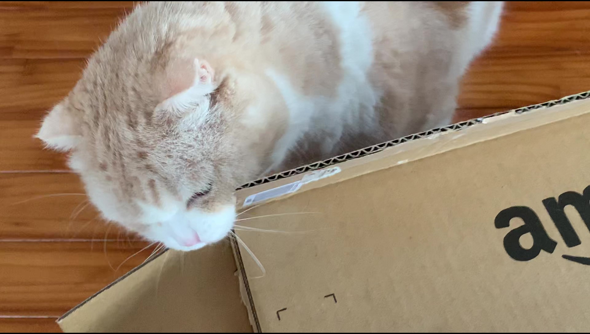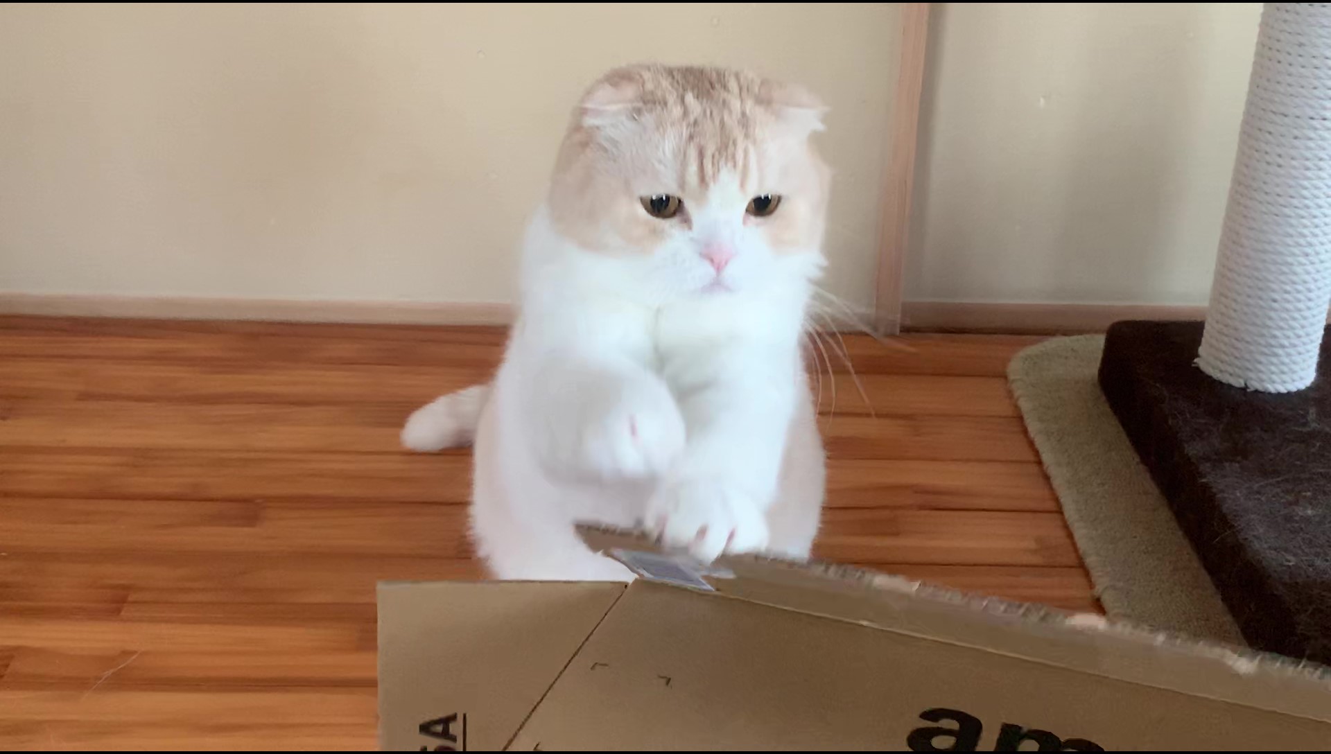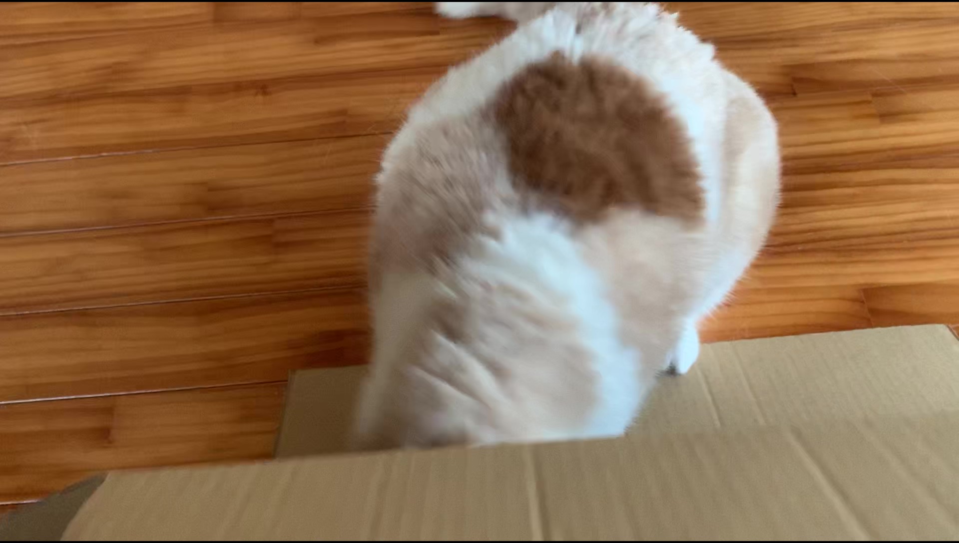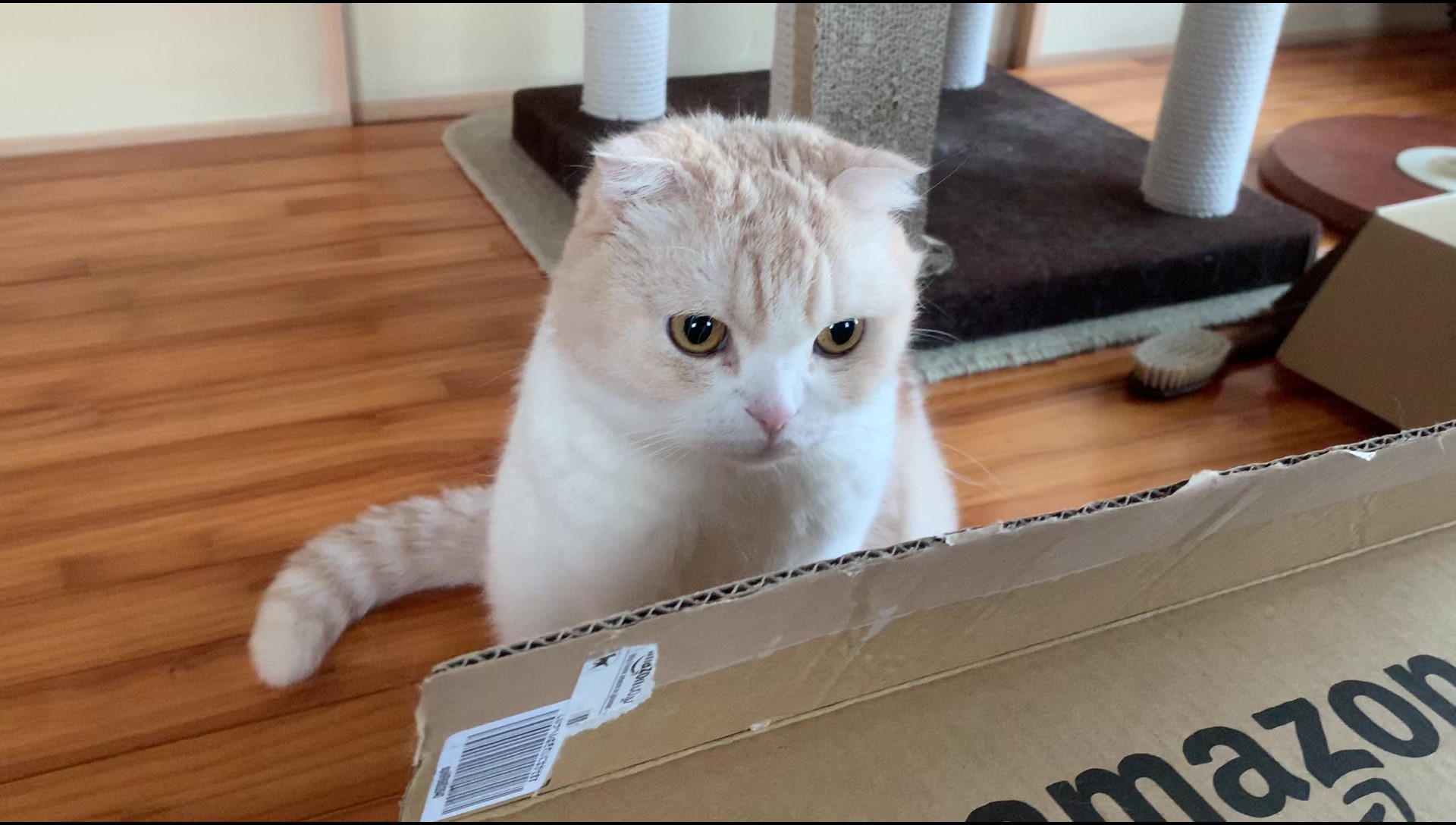 ナッツが、お気に入りのダンボール箱をみつめています。