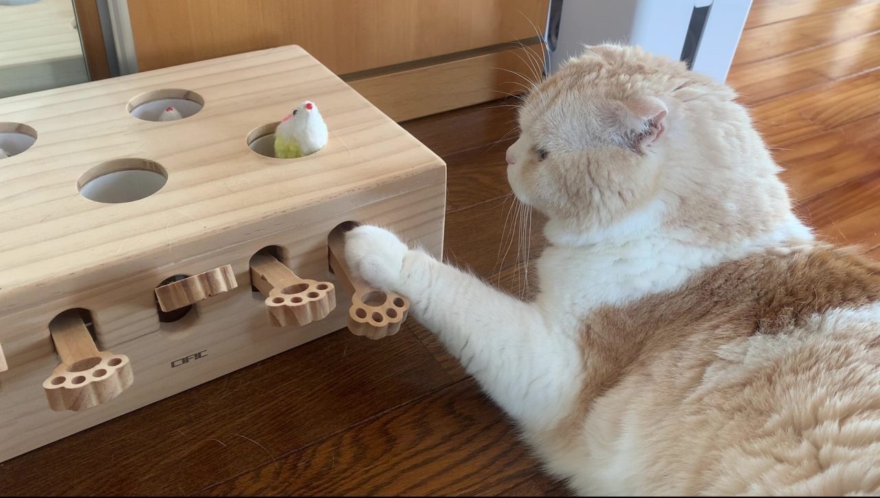 すりり~♡ もぐらたたきにお鼻をすりすりしています。 もぐらたたきはナッツのお気に入りのおもちゃなのです。