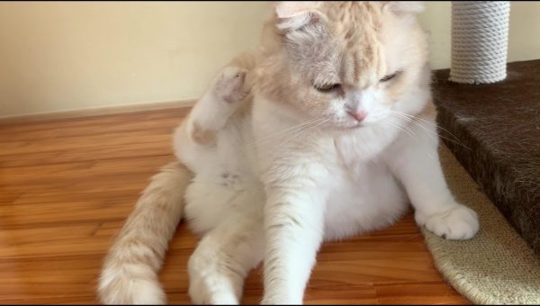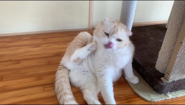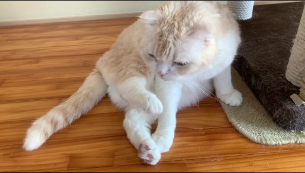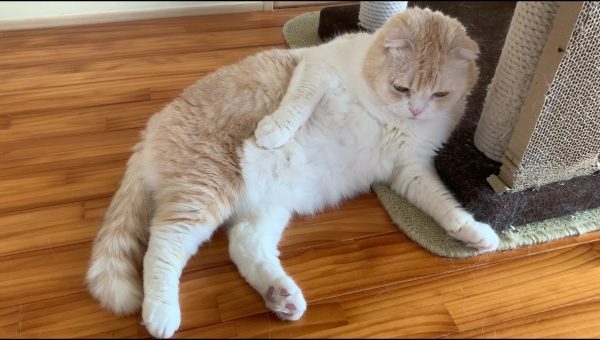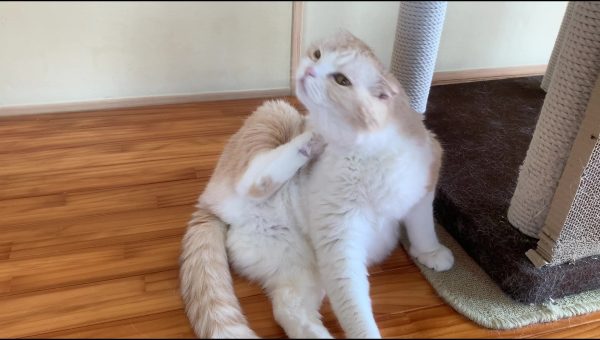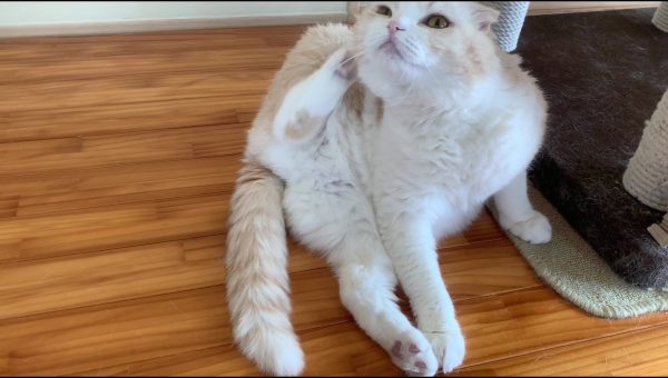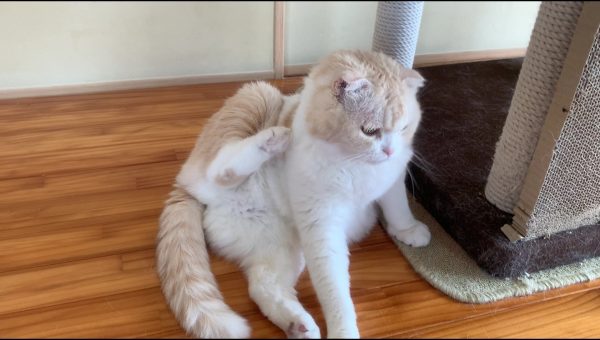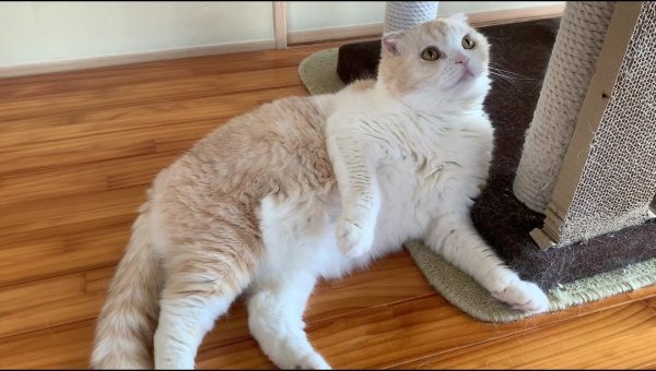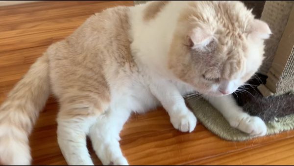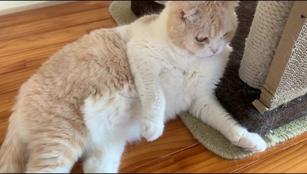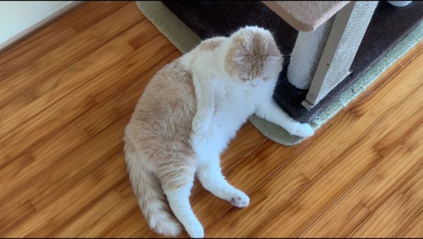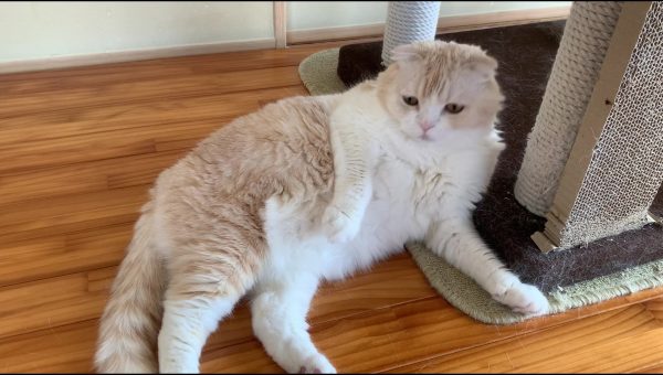 ナッツがキャットタワーに寄りかかってくつろいでいます♪
