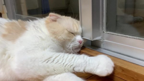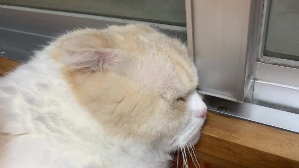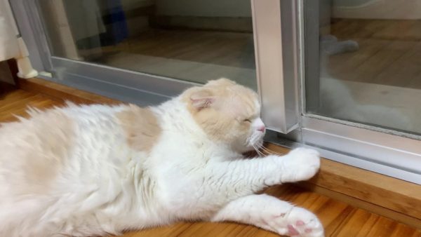 よくみると窓枠にお顔をぎゅぎゅっと押し当てています♪