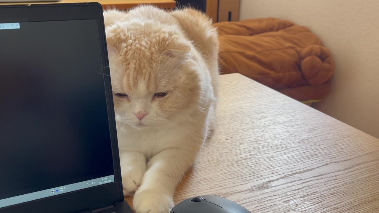 ぐりぐり♡ パソコンに額をくっつけて、パパを鼓舞してくれています♪