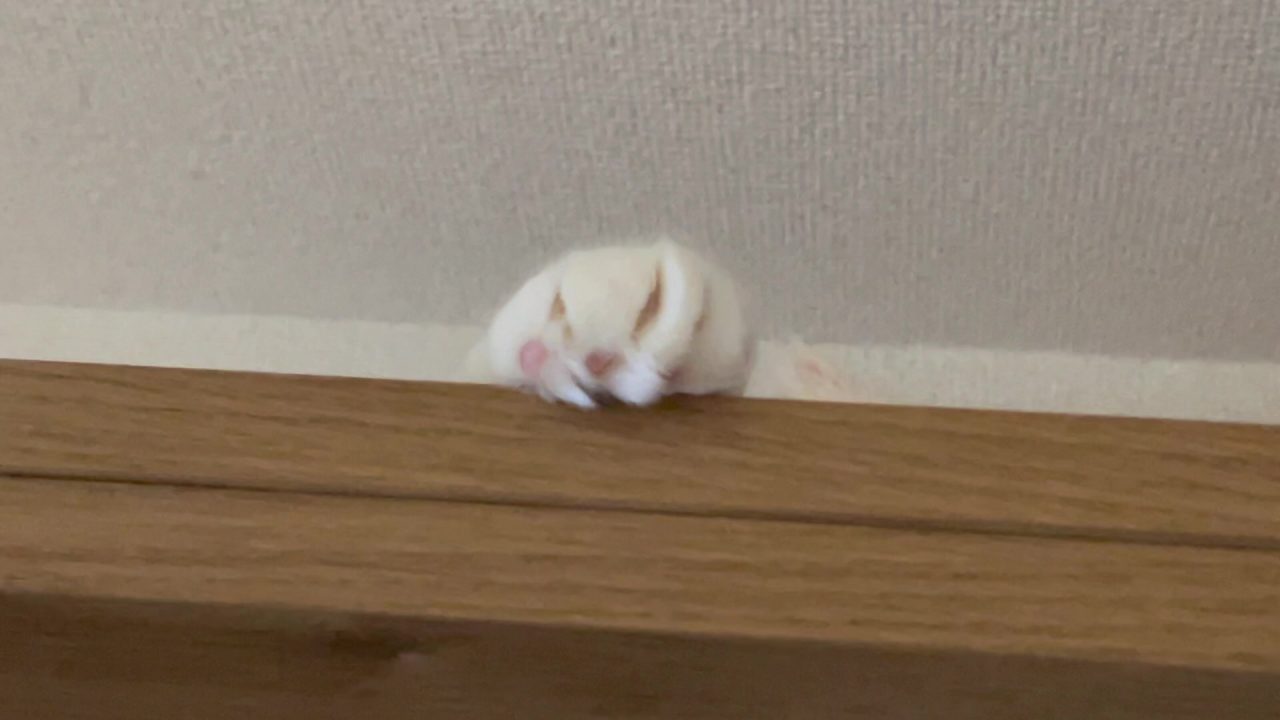 おやおや~。 キャットシェルフのてっぺんから、まんまるお手てがのぞいています♪