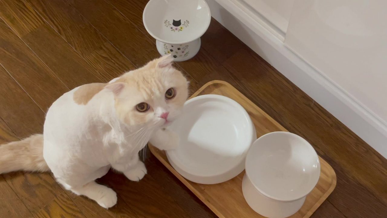 ぺしぺし! お家に帰ってきて、すこし落ち着いてきたこともあり、お皿をたたいて、ごはんのリクエスト!