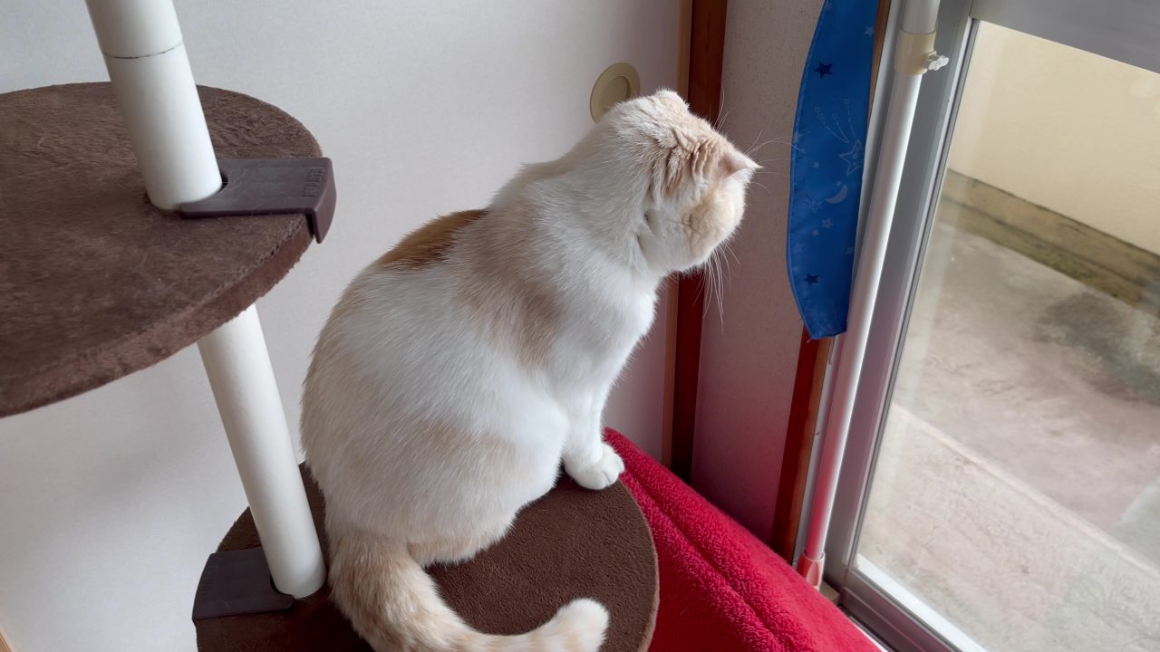 ナッツがキャットポールのうえからお外の景色を眺めています。