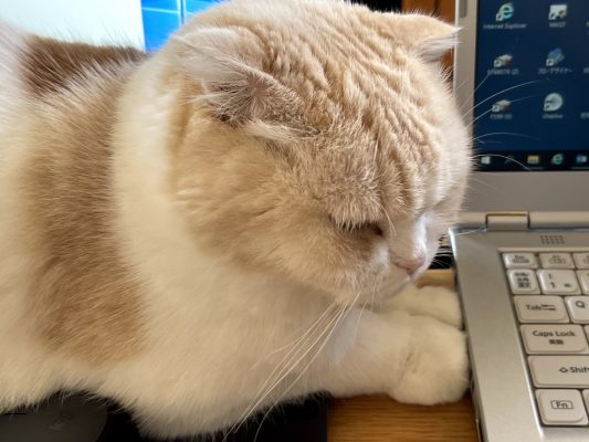 ナッツがパソコンのうえにおすわりしてくれています。