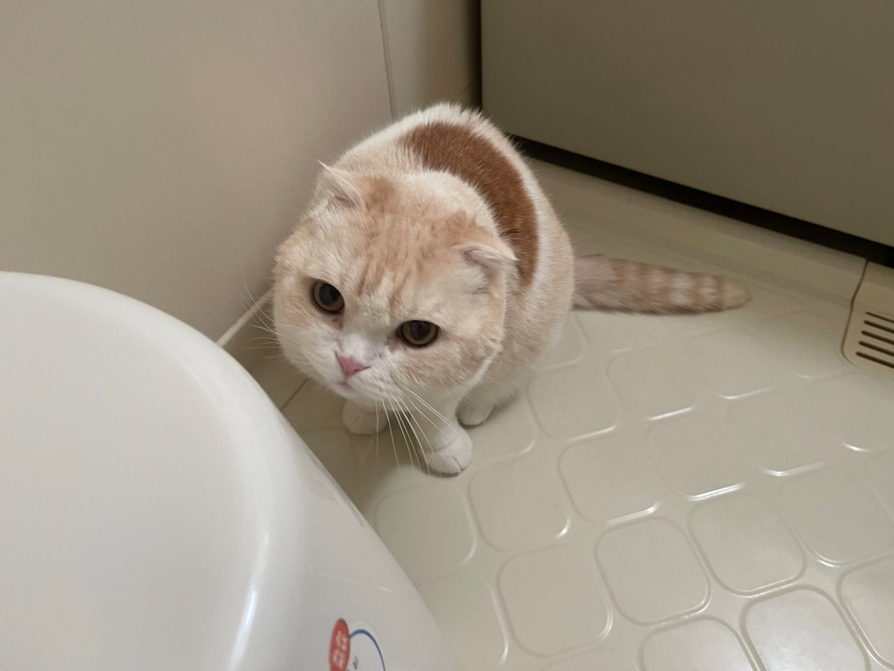 ナッツの姿がみえないので探していると、お風呂場に遊びにきていました♪
