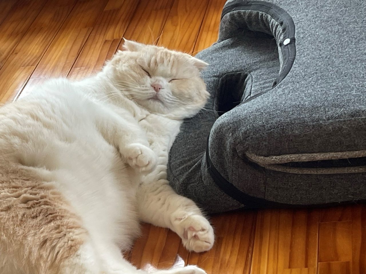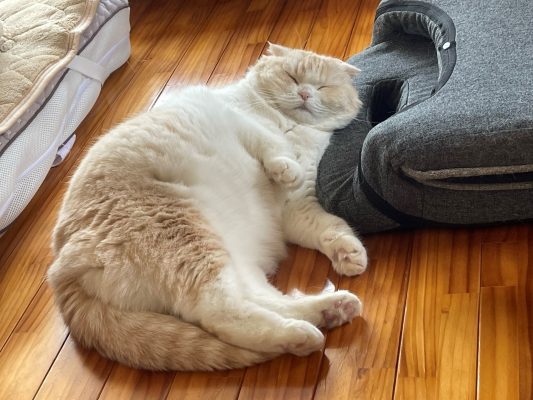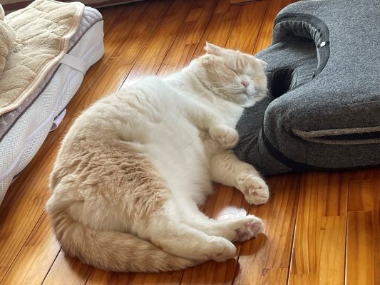 朝食後のナッツがくつろいでいます。 よく見ると、たたんでおいた座椅子を枕に、いい感じでよこになっています♪