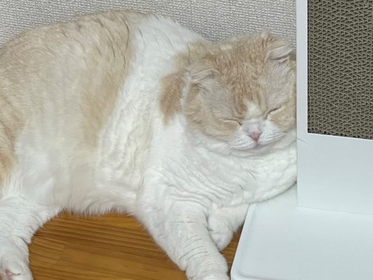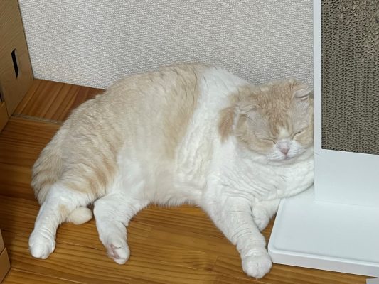 愛用のお爪とぎにもたれかかるかたちで、ナッツがくつろいでいます♪