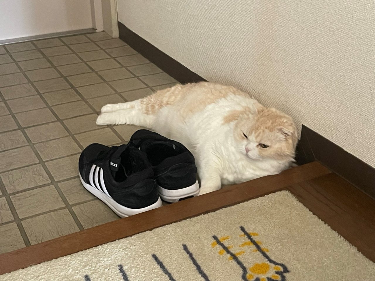 ナッツの姿が見えないので探していると、玄関で寝そべっていました♪