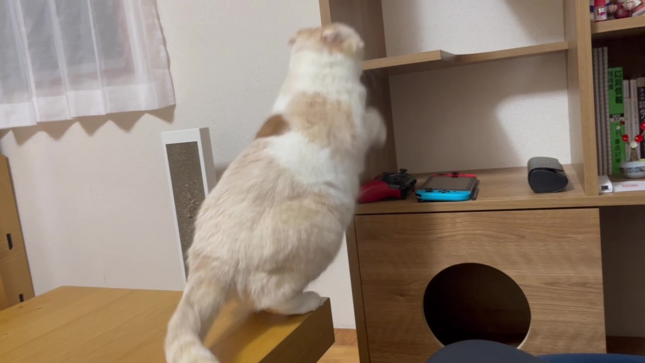 ナッツが、キャットシェルフに飛び乗るべくタイミングを見計らっています。