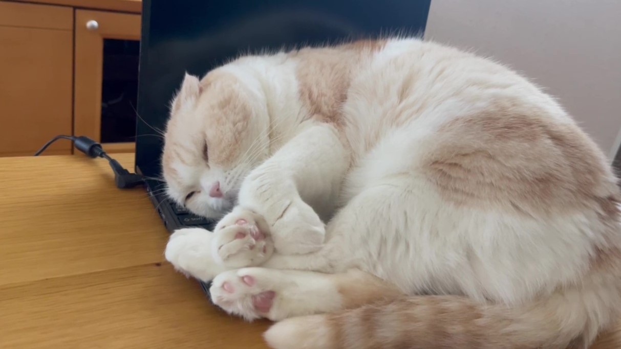 パソコンのうえで、ナッツがウトウトしています。