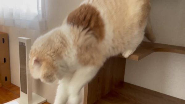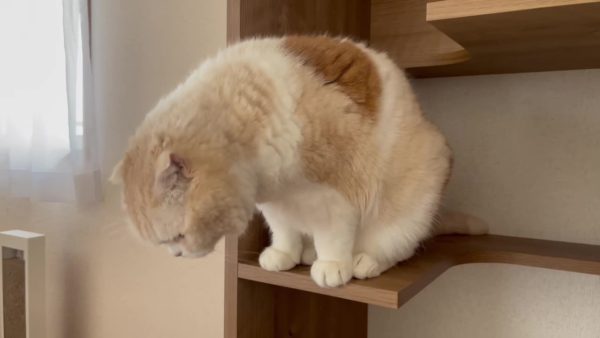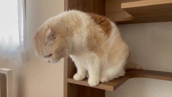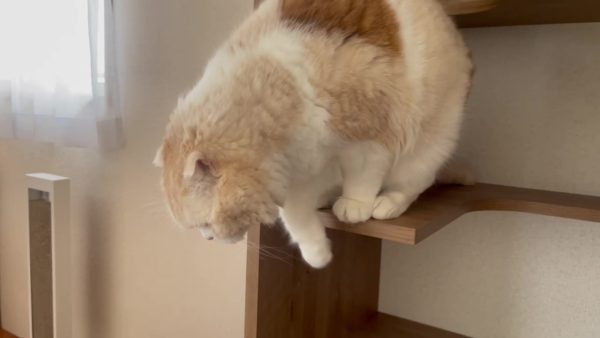 ナッツが、キャットシェルフのステップにおすわりしています。