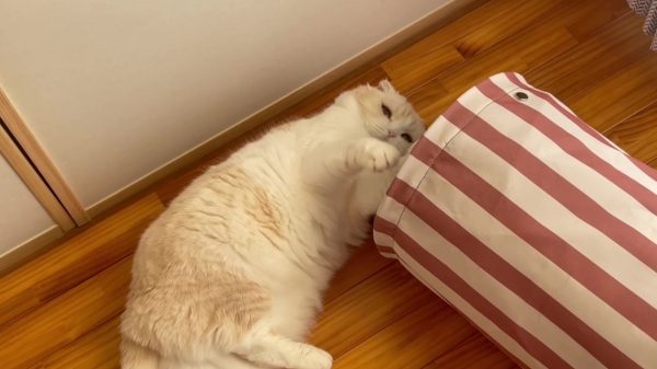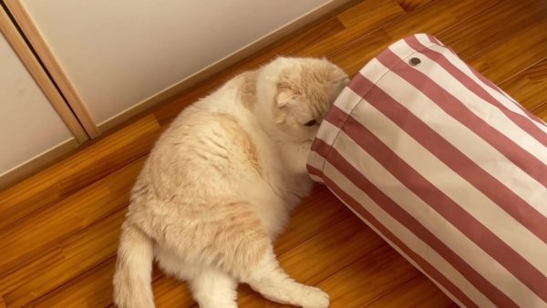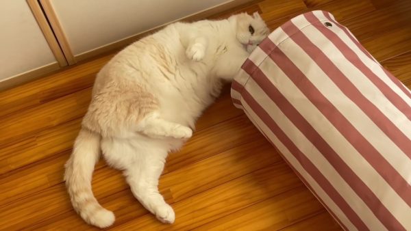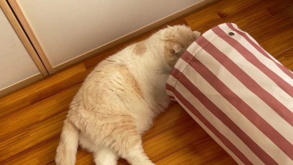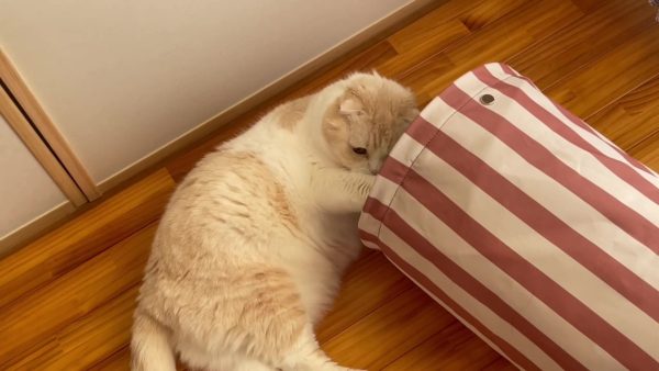 キャットトンネルのよこで、ナッツがくつろいでいます。