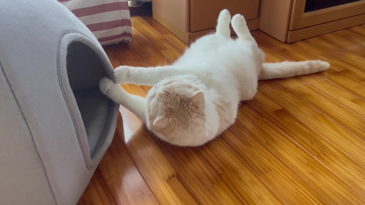 ナッツがよこになりながら、ナッツハウスの入り口に左のお手てでタッチしています。