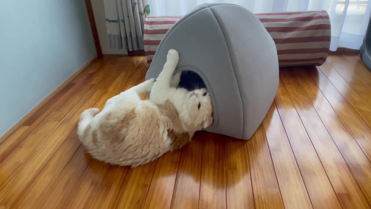 伸ばしたお手てで、ナッツハウスをしっかりと掴みます。