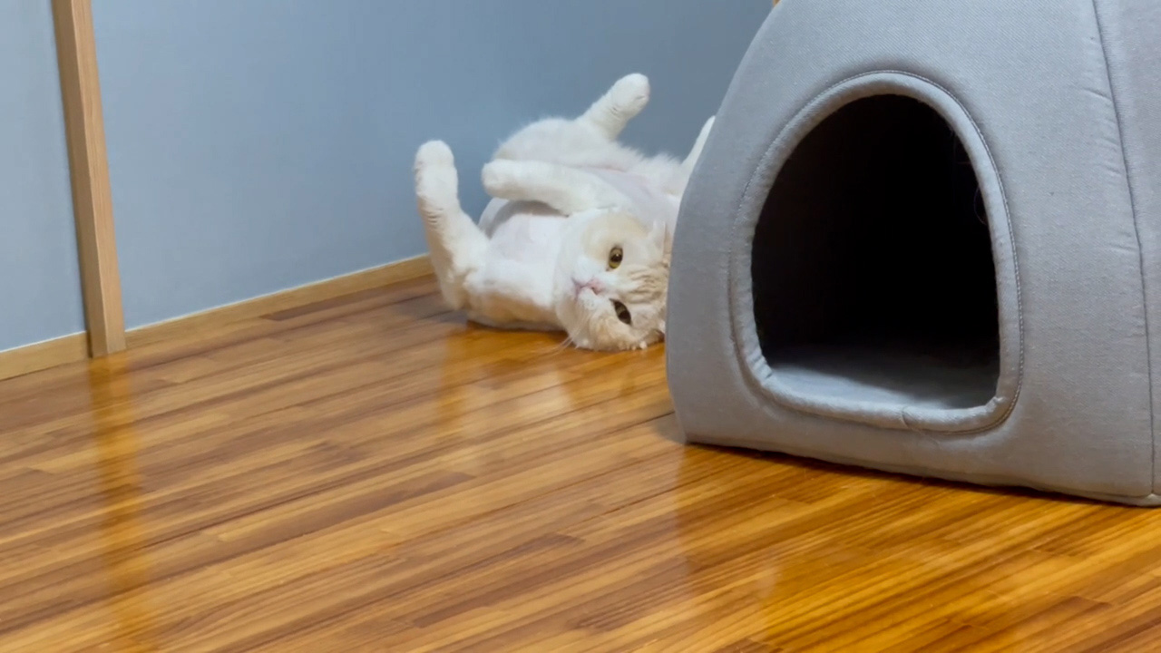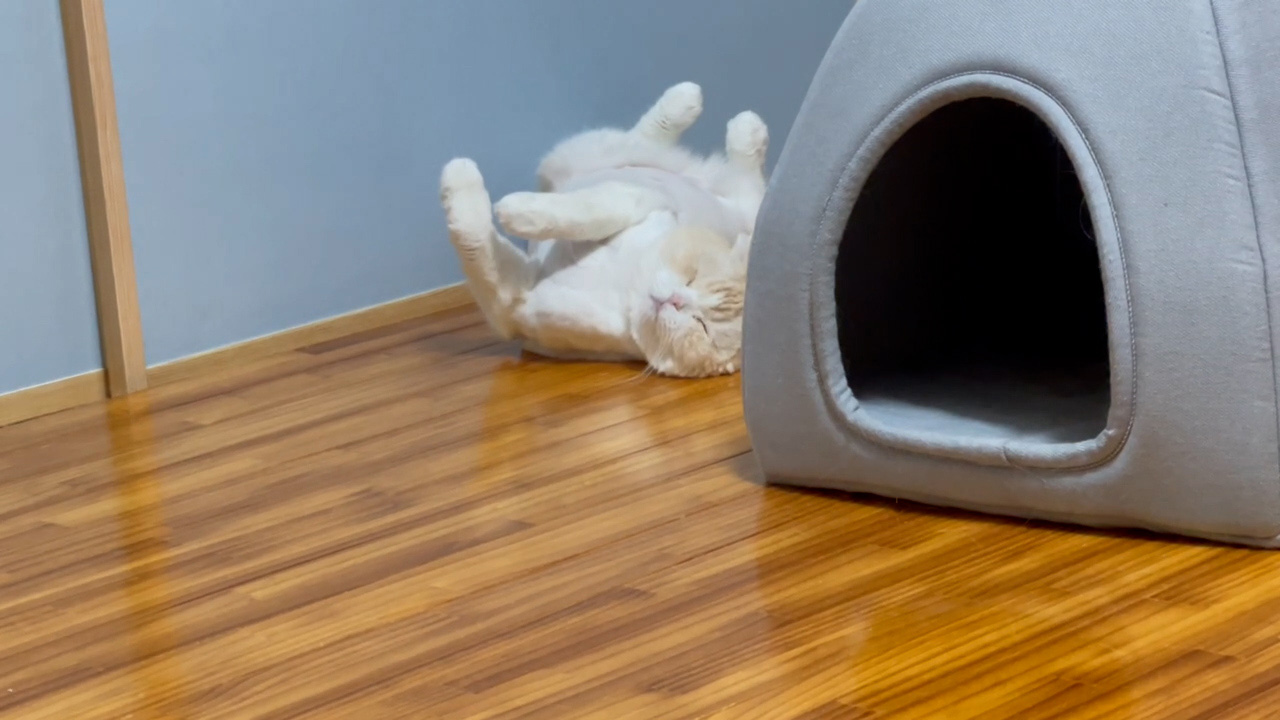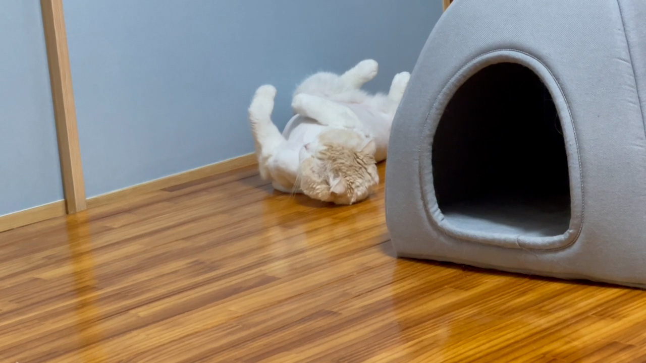 ナッツが、ヘソ天姿でくつろいでいます。
