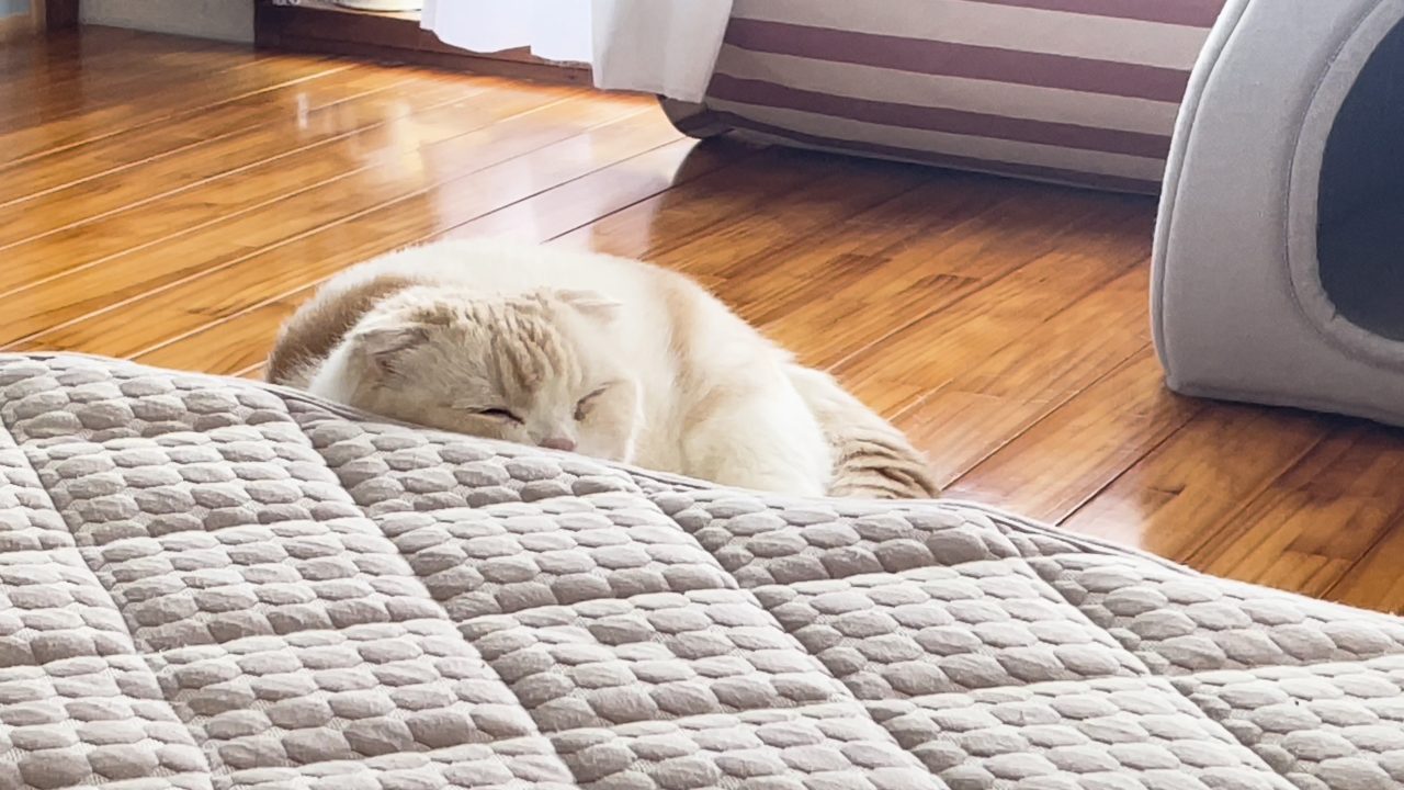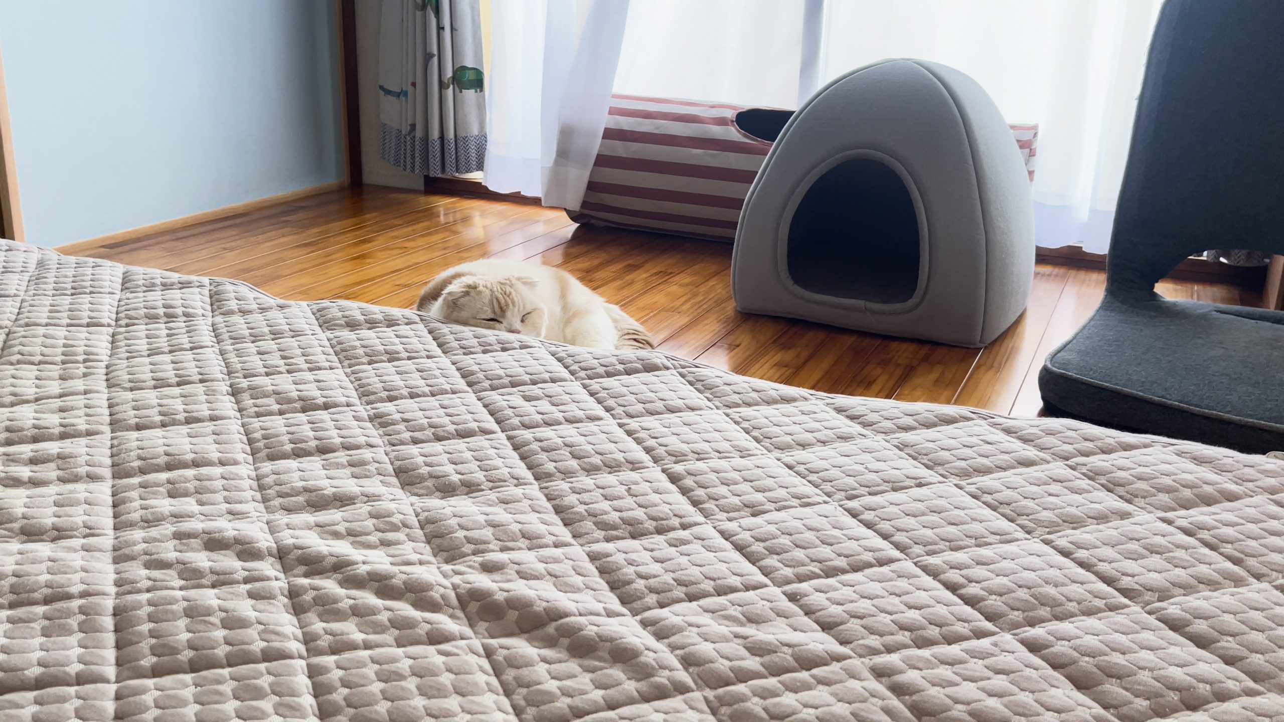 マットレスの向こうにナッツの姿が見えます。