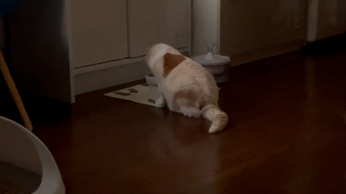 朝4時。お腹がすいたナッツが、そっとパパを起こしてくれました。 早速、ご飯を用意します。