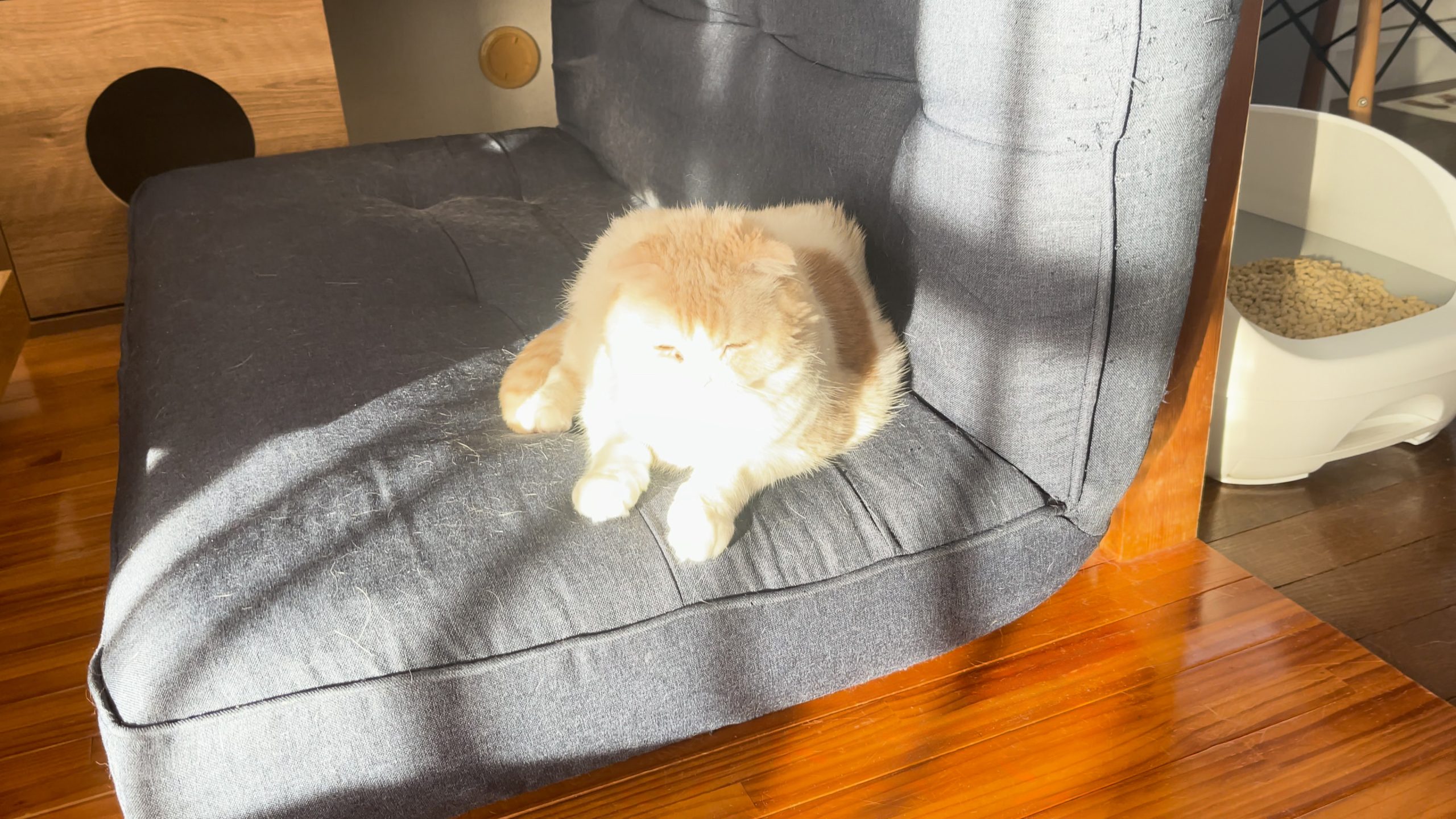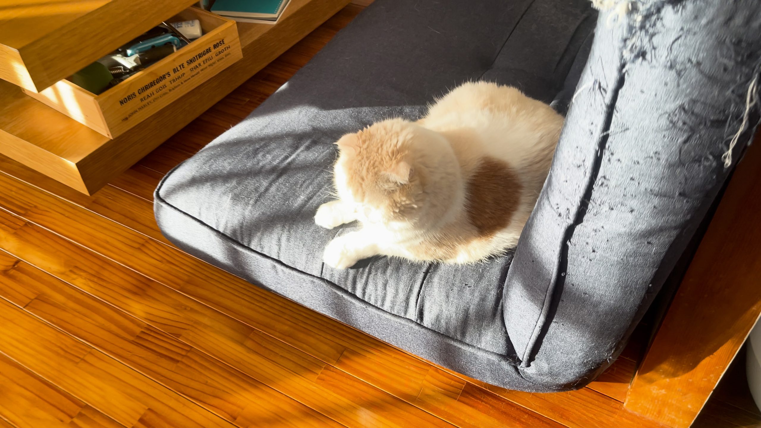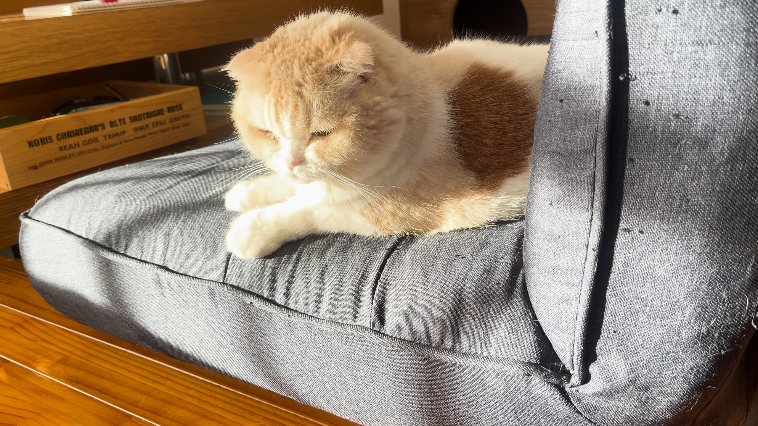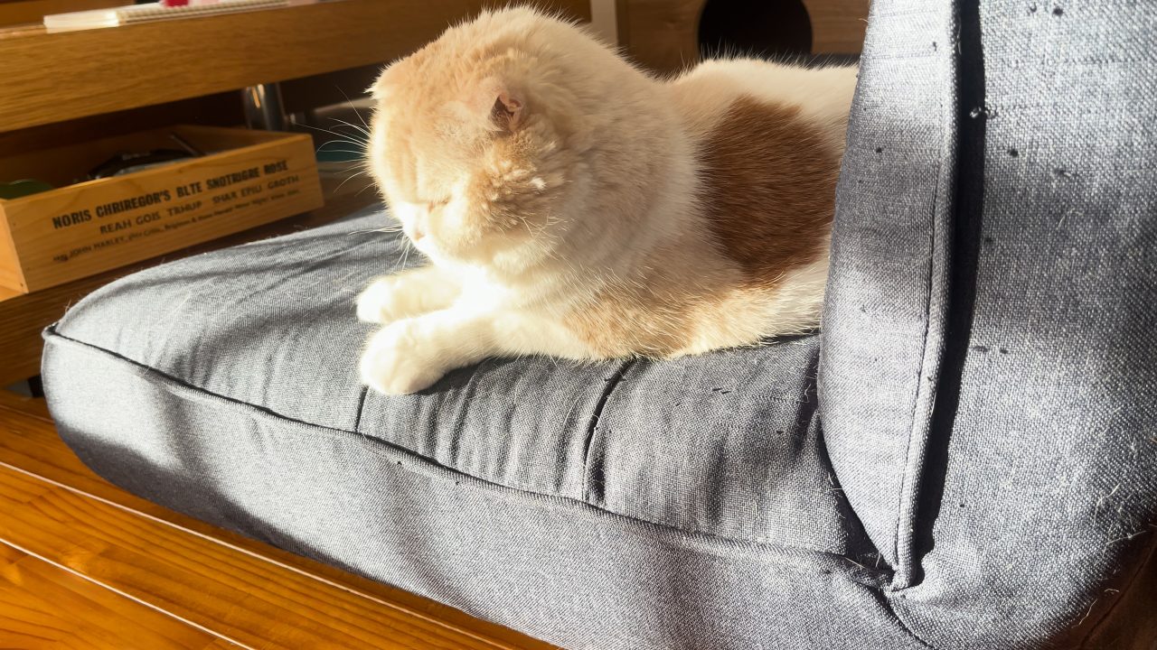 ソファーにおすわりしているナッツのところまで、夕日が差し込んでいます。