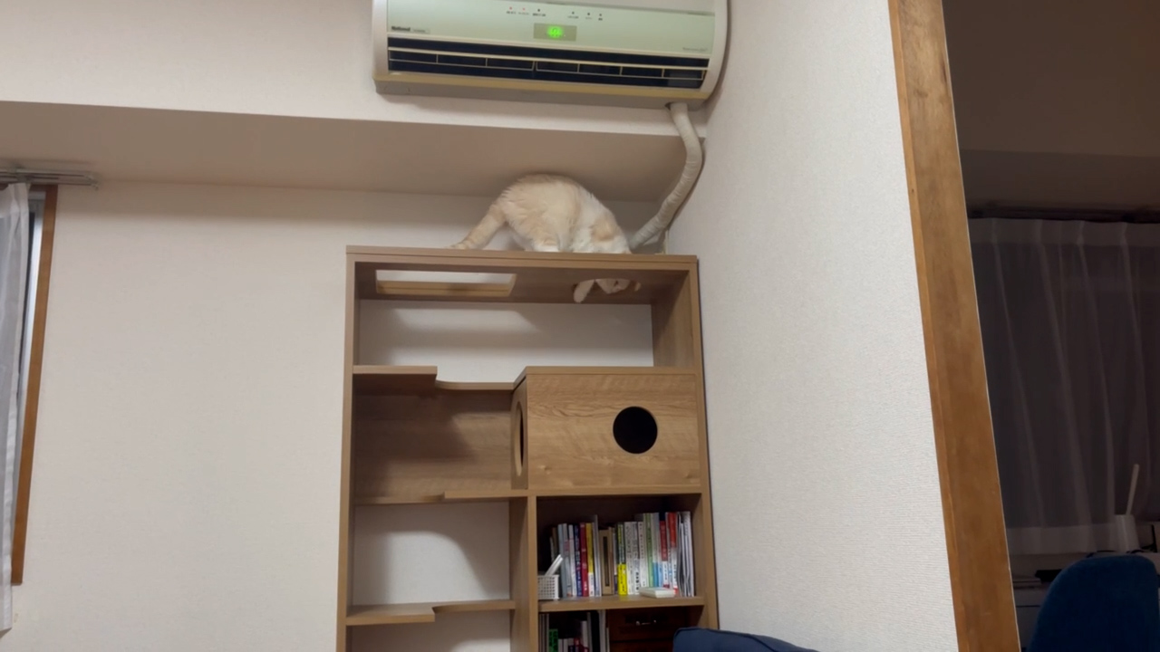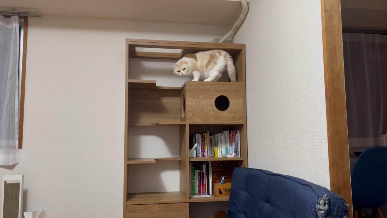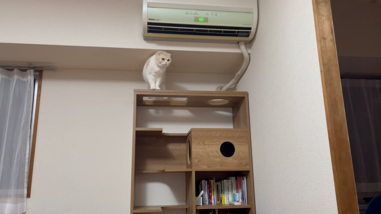 キャットタワーシェルフのてっぺんにナッツのすがたがあります。