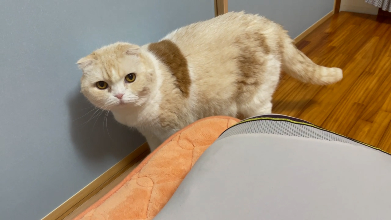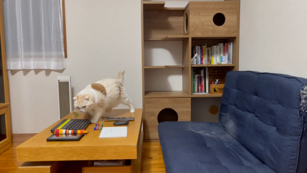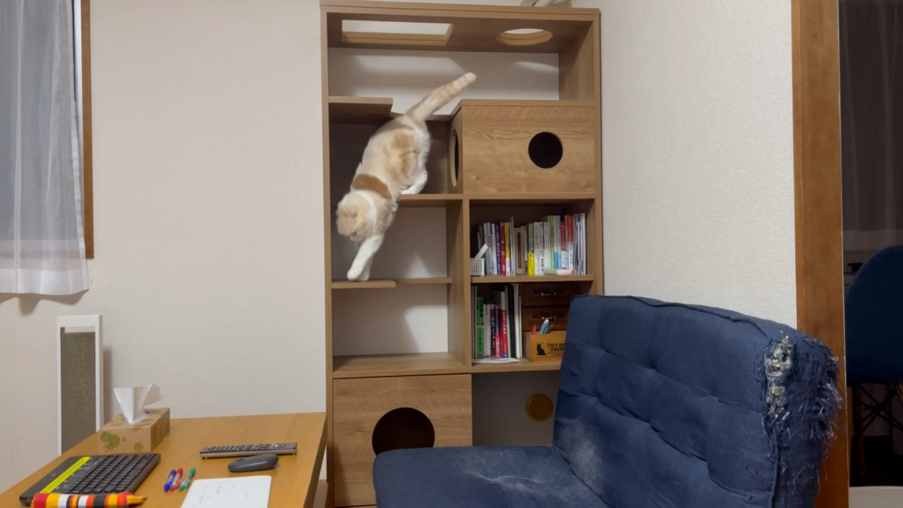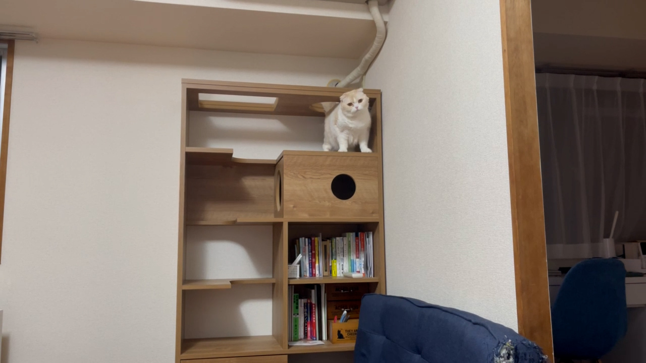 キャットタワーシェルフのてっぺんにナッツのすがたがあります。