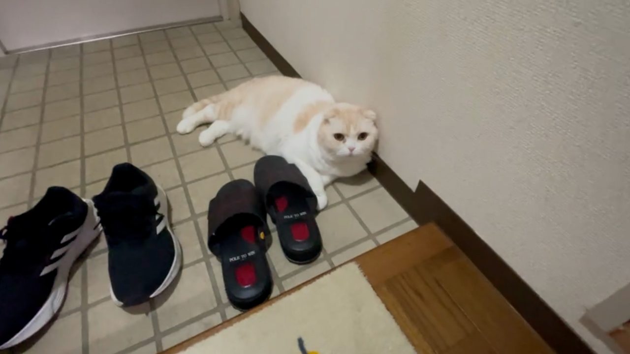 ナッツが玄関で、パパのことを守ってくれています。