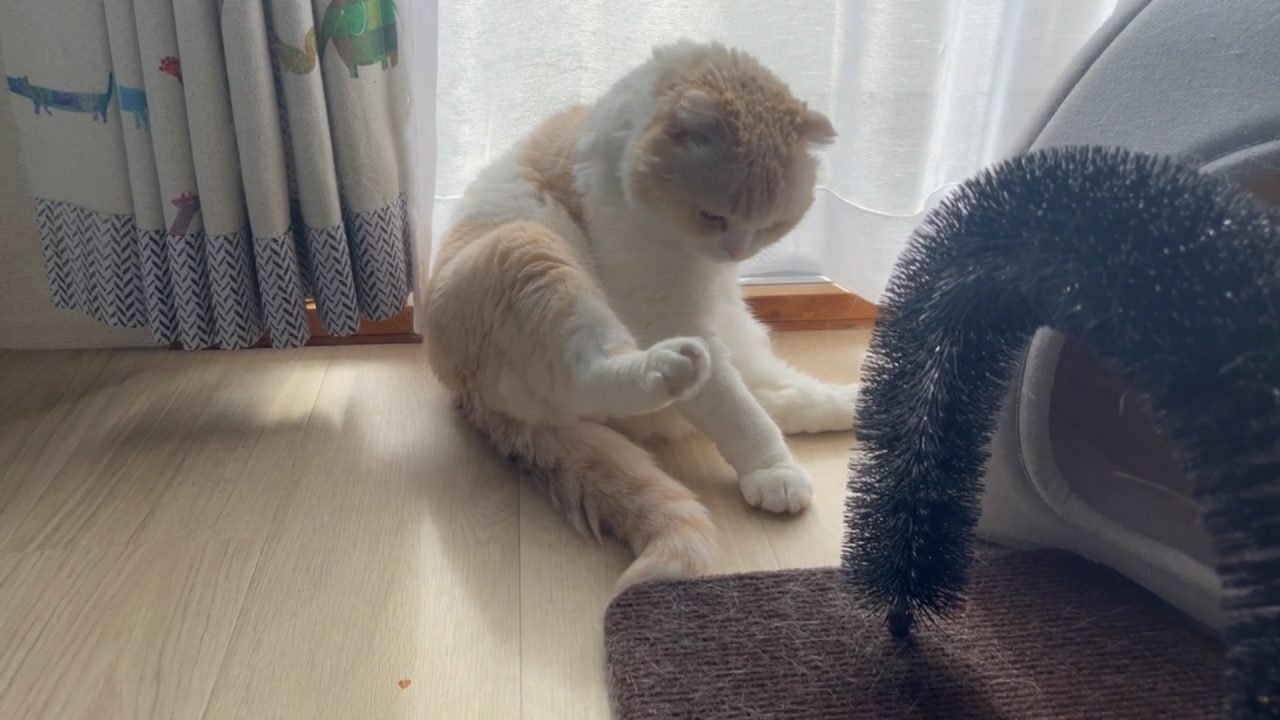 ナッツが、窓のそばでおすわりしています。