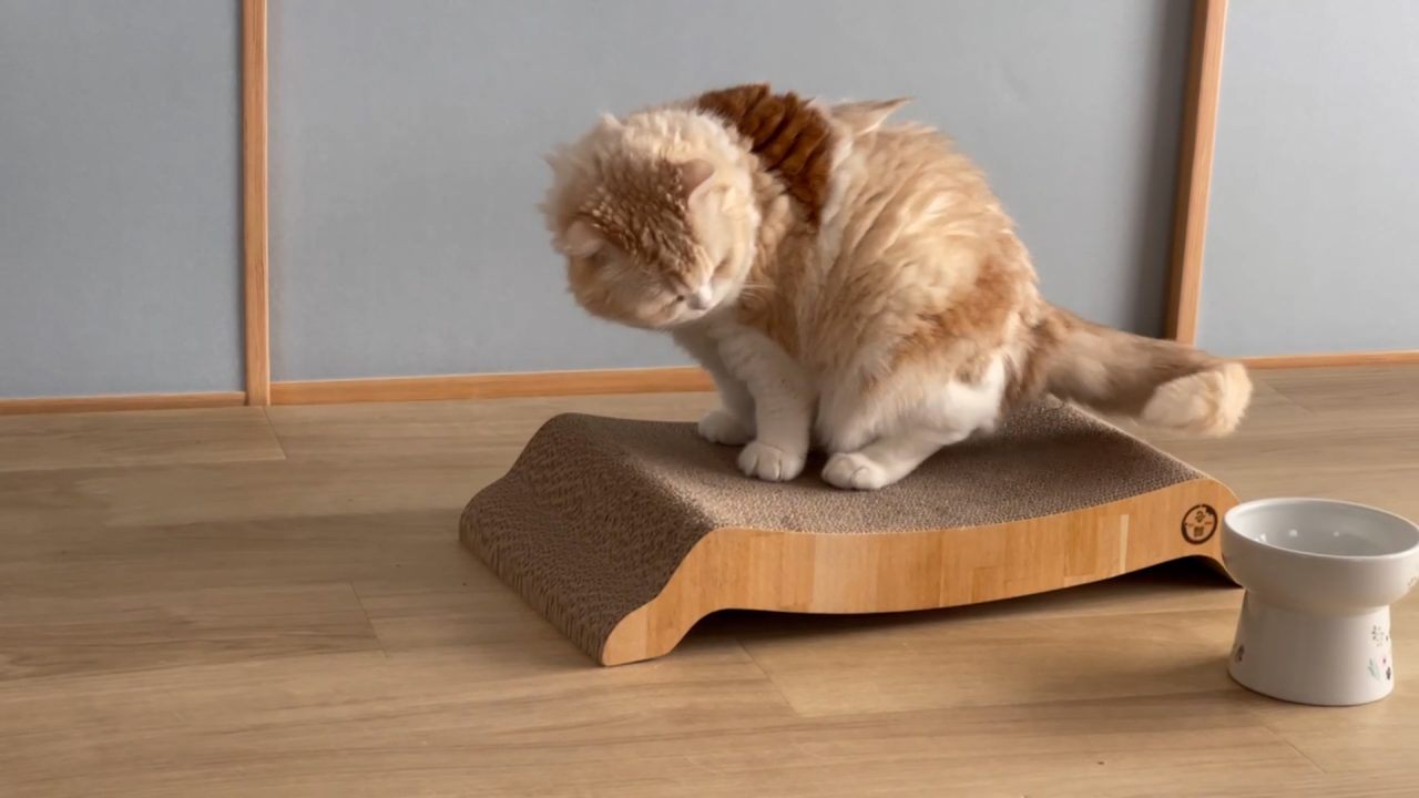 ナッツが、爪とぎベットのうえでくつろいでいます。