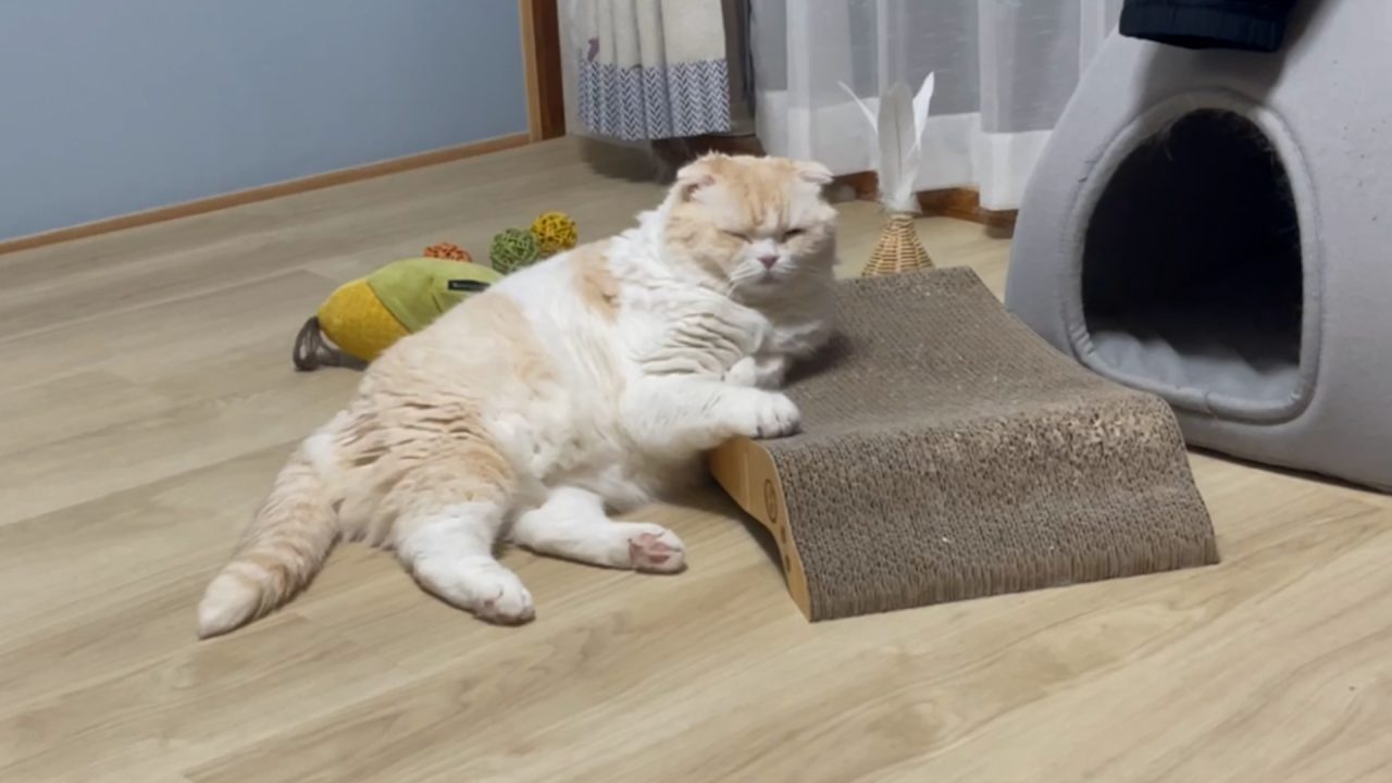 爪とぎベットに、もたれかかって、ナッツがくつろいでいます。