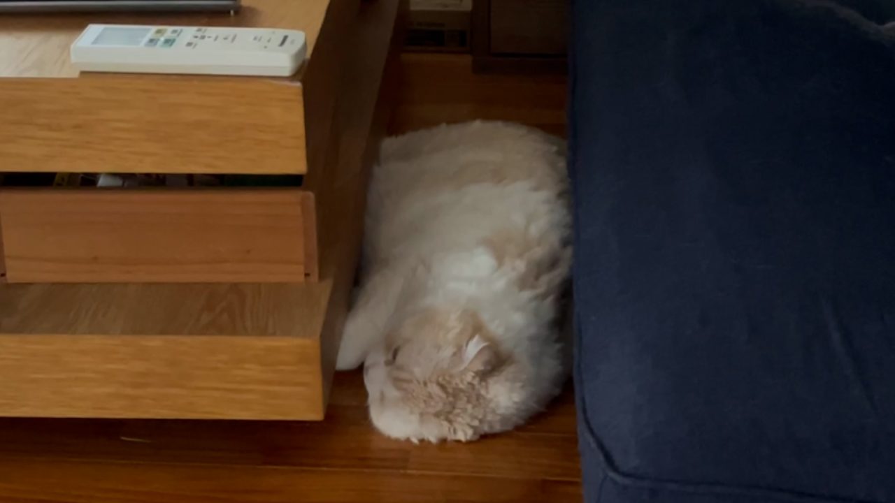 ソファーとテーブルの間で、ナッツがよこになっています。