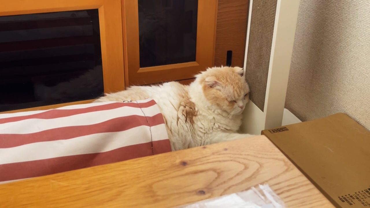 ナッツが、爪とぎ器にもたれかかっています。