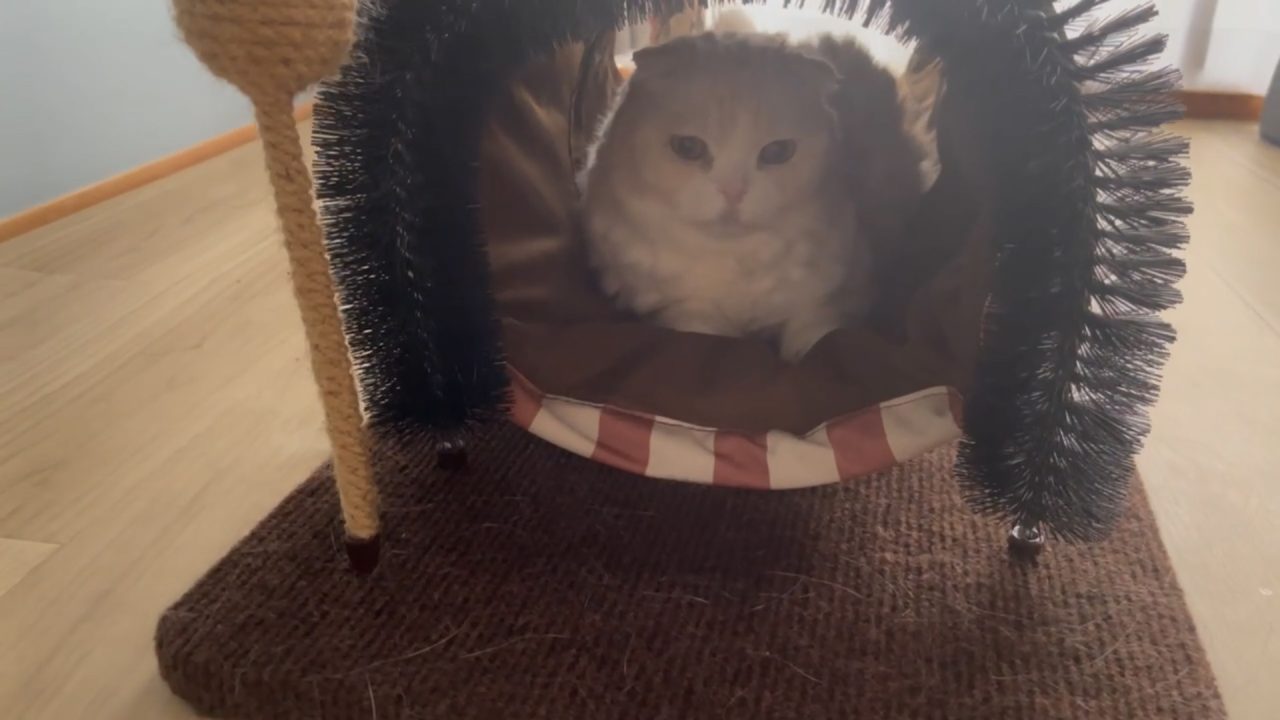 キャットトンネルの中で、ナッツがくつろいでいます。