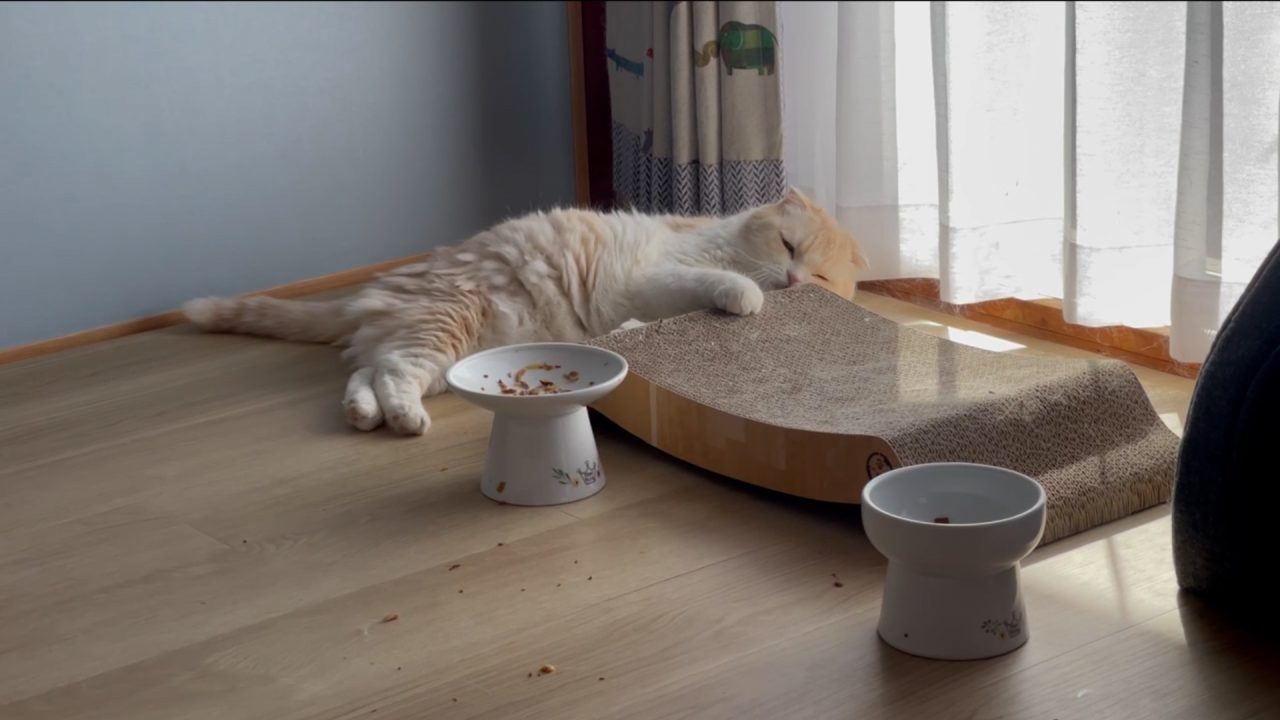 お気に入りの爪とぎベットに、ナッツがお手てをのせています。