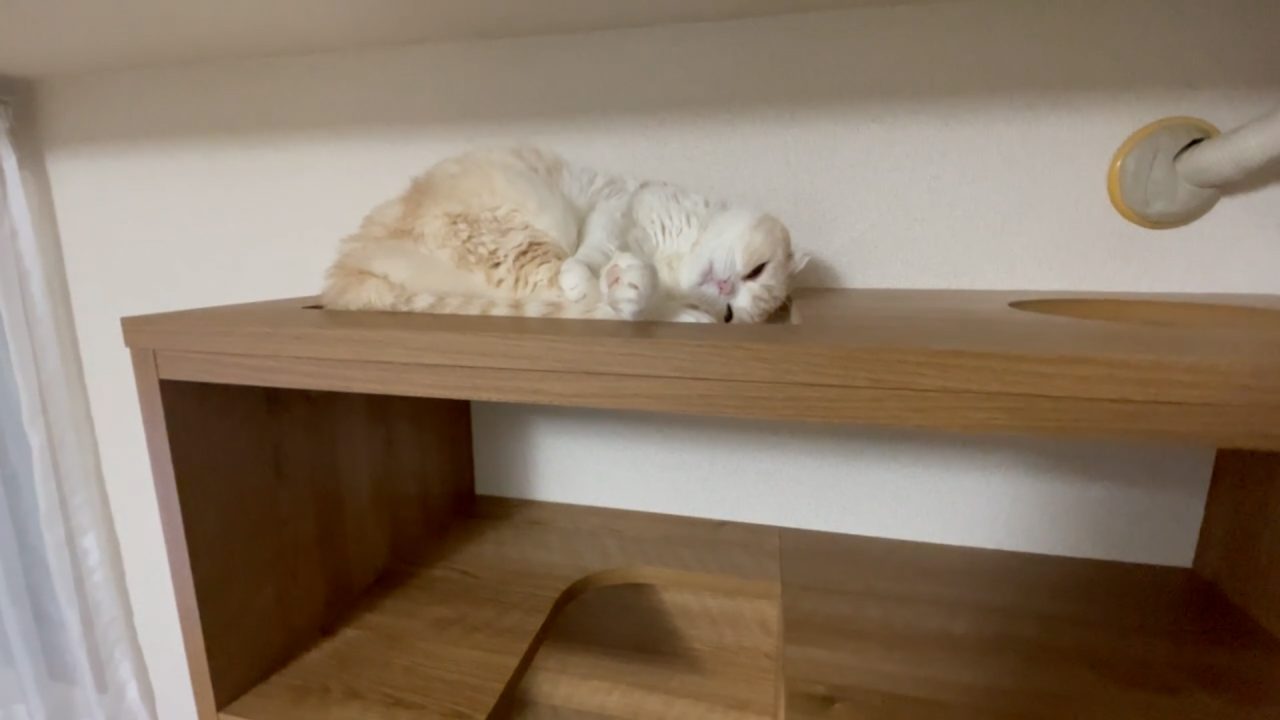 キャットシェルフのてっぺんで、ナッツがくつろいでいます。