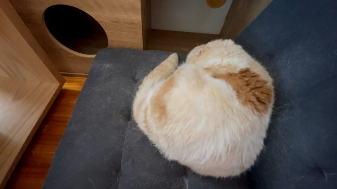 視線を移した先には、まぁるく丸まって寝んねするナッツの姿があります。