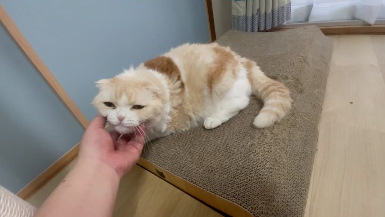 爪とぎベットの上で、ナッツがくつろいでいます。
