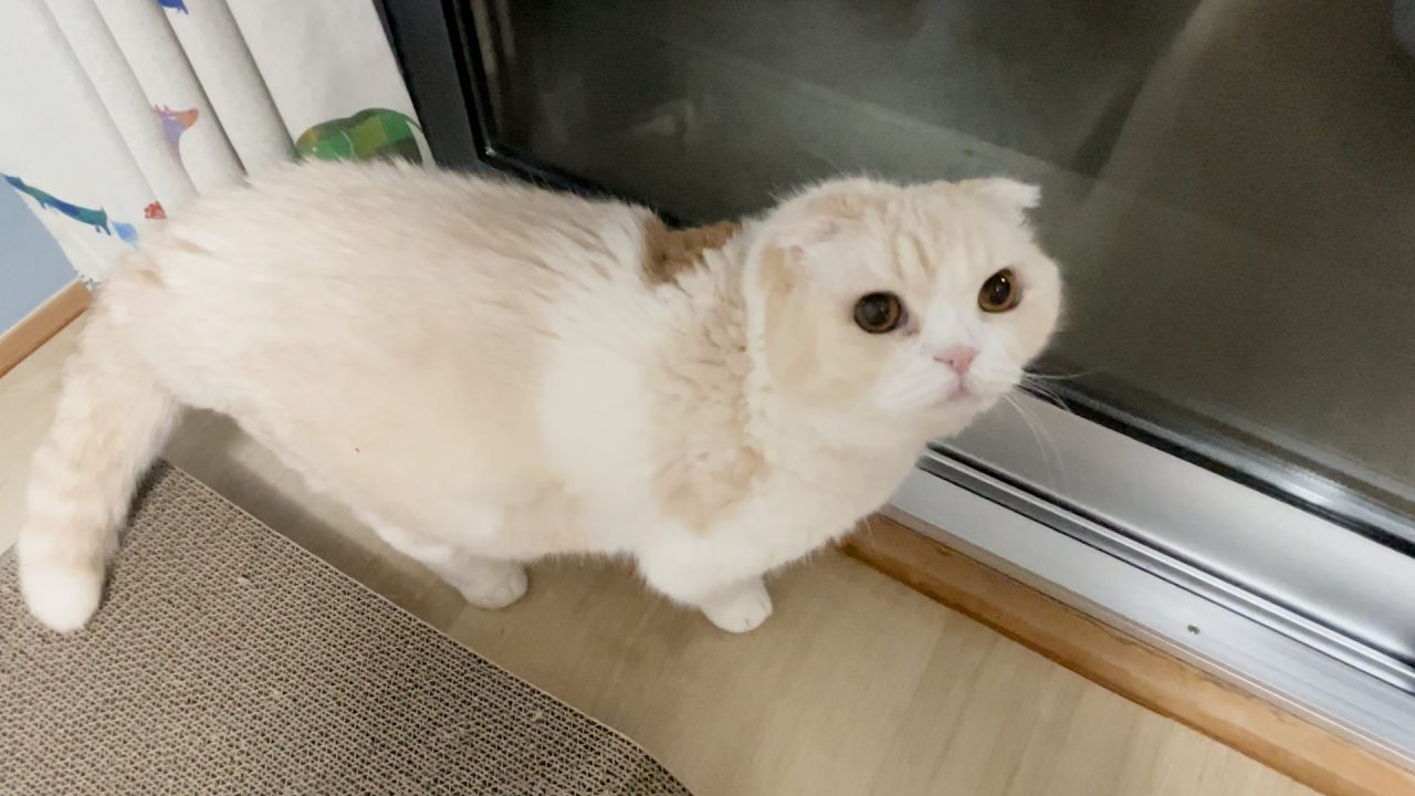 ナッツが、玄関でおすわりしています。