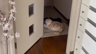 ナッツが、横になりつつお気に入りの座椅子にお手てをのせています。