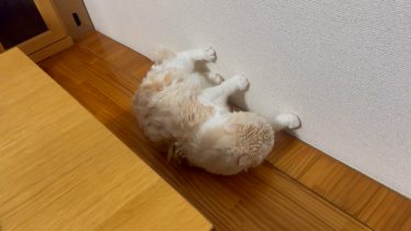 ナッツが、壁にぴったりとお手てとあんよをくっつけています。