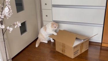 ナッツが、ダンボール箱で遊んでいます。